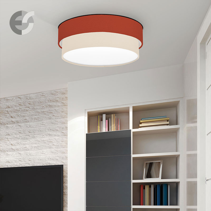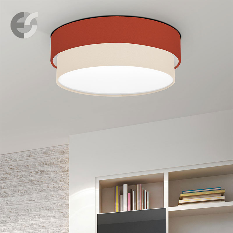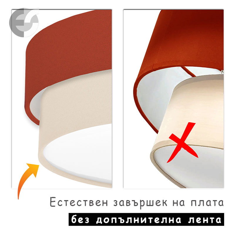 Осветително тяло - плафон CAKE, изработен от метална основа, два текстилни абажура и бял PVC разсейвател. Плафонът се предлага в над 50 различни комбинации от цветове. Изберете най-подходящата за вас комбинация от цветове и добавете към всяка стая модерен акцент и светлина. Осветителното тяло е подходящо за осветление на спалня, осветление за всекидневна, осветление за детска стая, осветление за кухня, осветление за коридор.