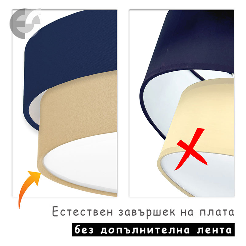 Осветително тяло - плафон CAKE, изработен от метална основа, два текстилни абажура и бял PVC разсейвател. Плафонът се предлага в над 50 различни комбинации от цветове. Изберете най-подходящата за вас комбинация от цветове и добавете към всяка стая модерен акцент и светлина. Осветителното тяло е подходящо за осветление на спалня, осветление за всекидневна, осветление за детска стая, осветление за кухня, осветление за коридор.