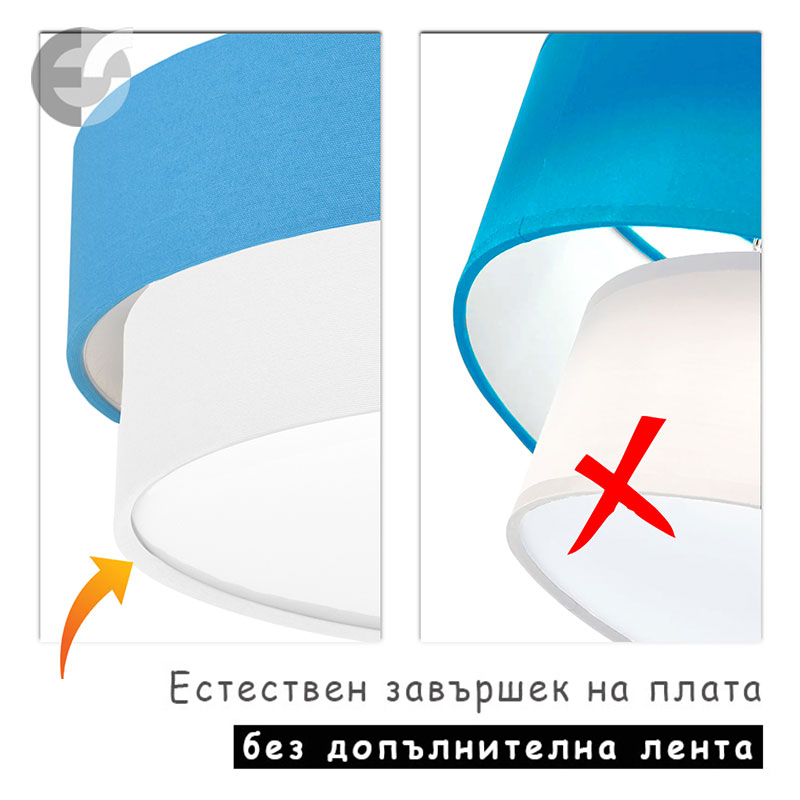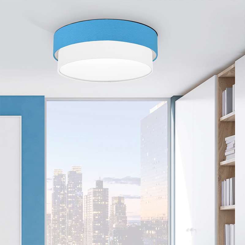 Осветително тяло - плафон CAKE, изработен от метална основа, два текстилни абажура и бял PVC разсейвател. Плафонът се предлага в над 50 различни комбинации от цветове. Изберете най-подходящата за вас комбинация от цветове и добавете към всяка стая модерен акцент и светлина. Осветителното тяло е подходящо за осветление на спалня, осветление за всекидневна, осветление за детска стая, осветление за кухня, осветление за коридор.