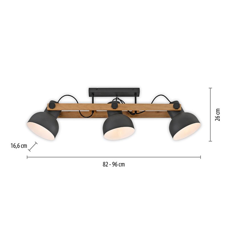 Лампата за таван е с три въртящи се светлоизточника, които позволяват независимо насочване на светлината точно там, където е необходима за целенасочено осветяване; три фасунги E27, които дават възможност за избор на различни видове крушки според предпочитанията ви; IP20 защита за вътрешна употреба; стилна комбинация от топло дърво и индустриален метал, която добавя характер и автентичност към интериора.