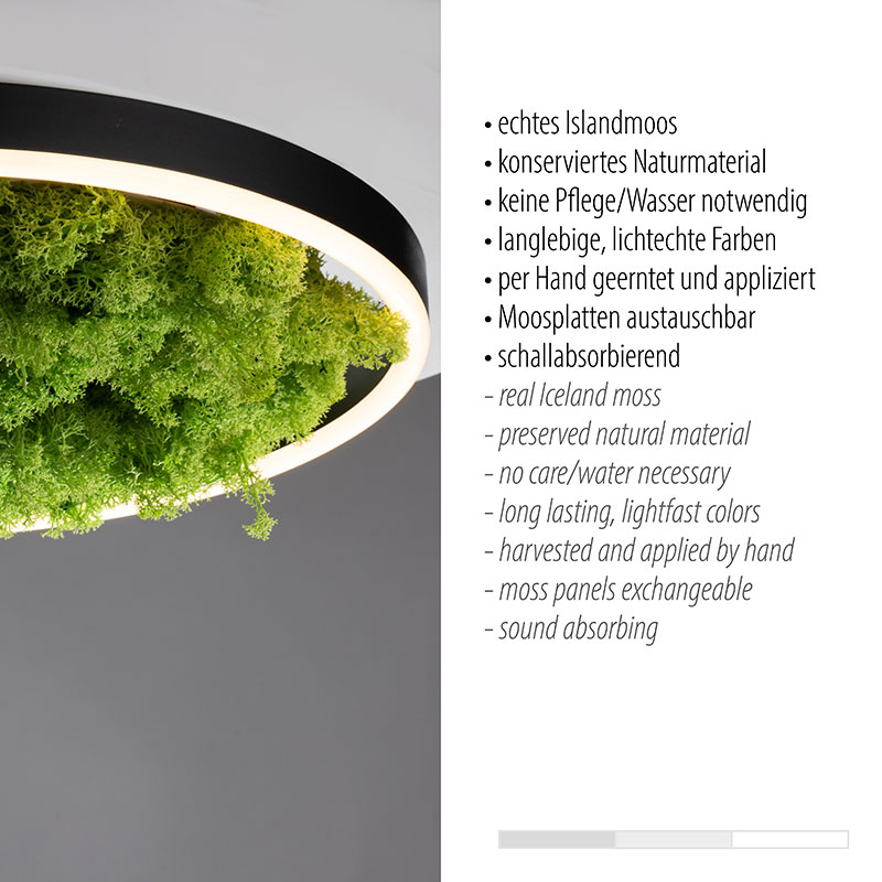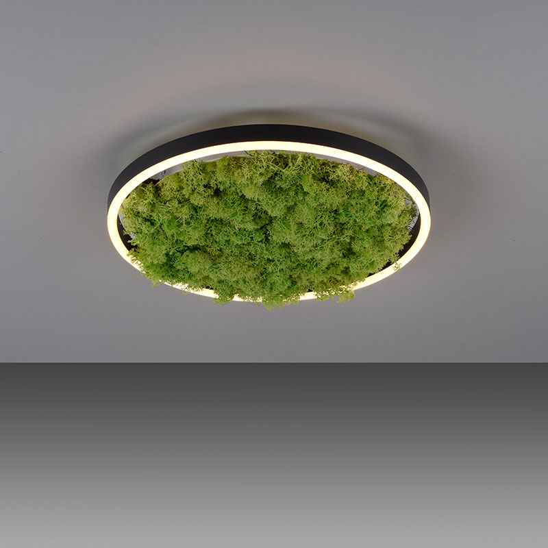 С тази кръгла LED таванна лампа, вашият дом ще засияе с естествена светлина. Нейният стилен черен дизайн с истински исландски мъх придава на помещението уют и елегантност. Лампата осигурява приятна топла бяла светлина с цветна температура от 3000K, която ви подканва да се отпуснете и в хармонична атмосфера.