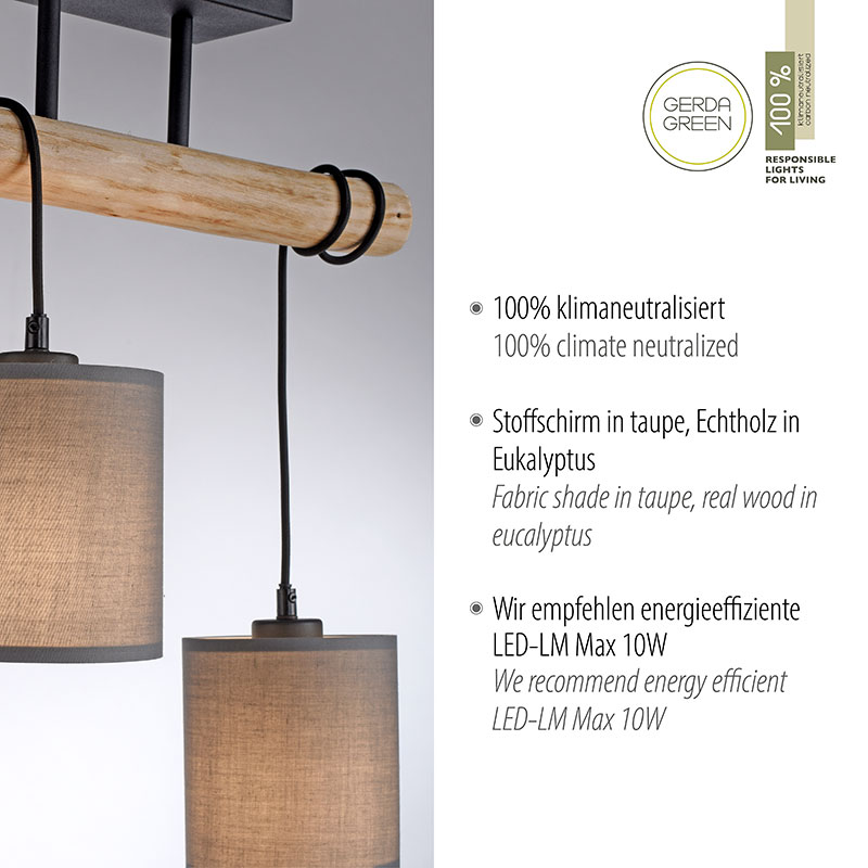 Осветително тяло - винтидж плафон, изработен от метална черна основа, с греда от дърво и висящи текстилни абажури. Дизайнът на осветителното тяло е подходящ за осветление за всекидневна, осветление за кухня, осветление за коридор, осветление за спалня. Производител Leuchten Direkt, Германия.