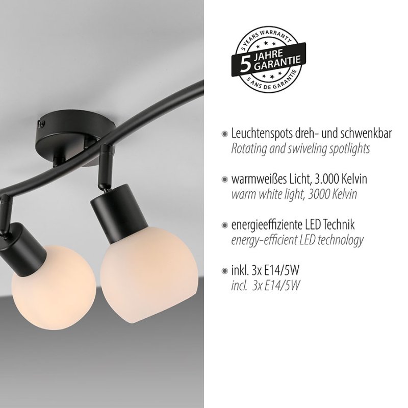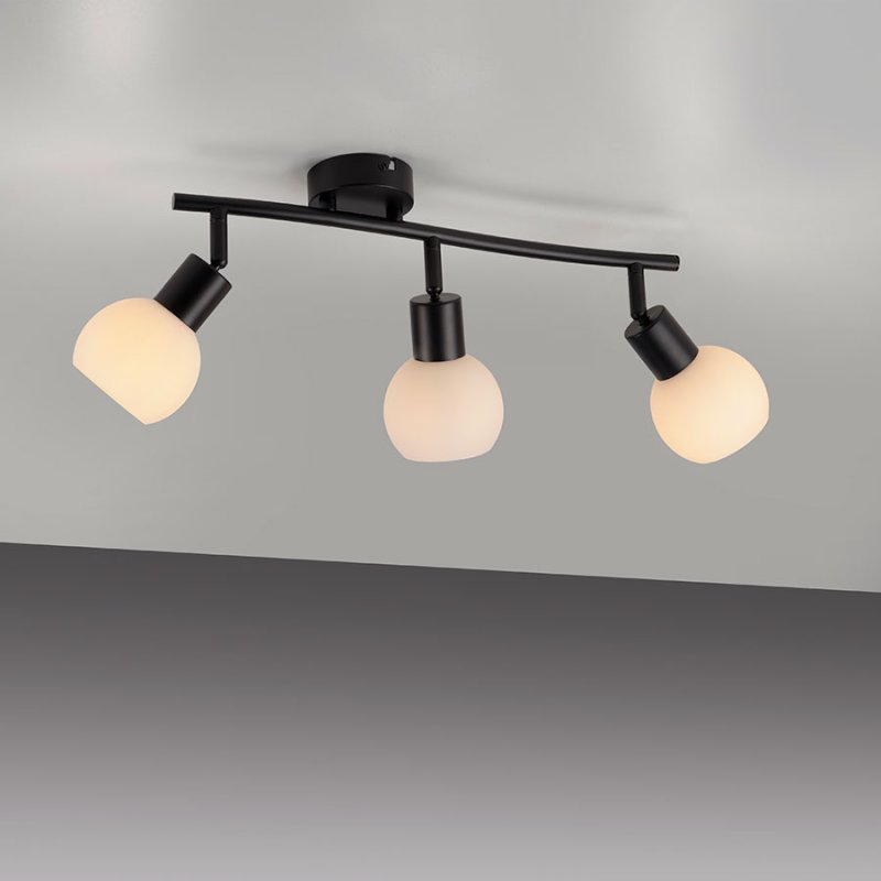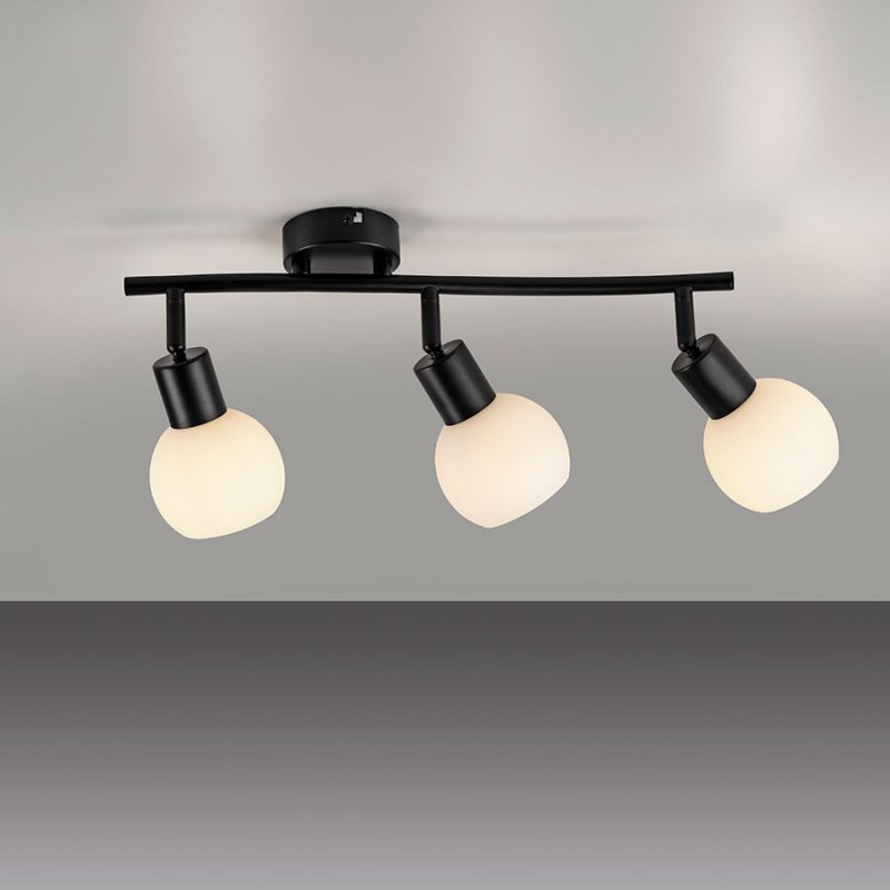 Плафон LOKI с три светлини и цокъл E14 се отличава с изчистен дизайн и линейна форма. Лампата е изработена от метална основа в черен цвят, съчетана с разсейвател от опаловo стъкло, който осигурява равномерно и меко осветление.