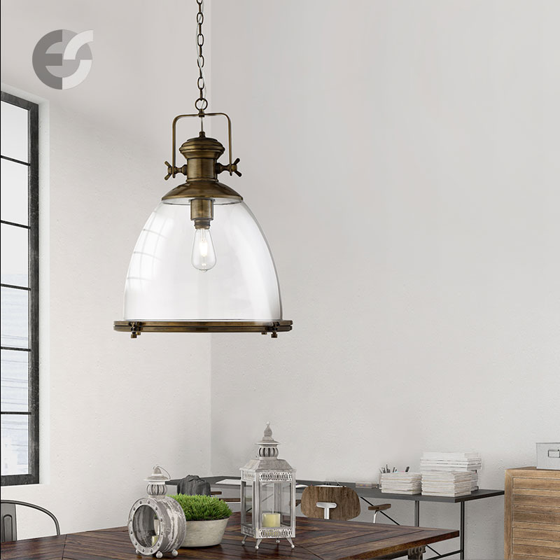 Осветително тяло - полилей Industrial Pendants с оригинален, индустриален дизайн, изработен от метал с месингово покритие и разсейвател от прозрачно стъкло. Производител Searchlight, Англия.