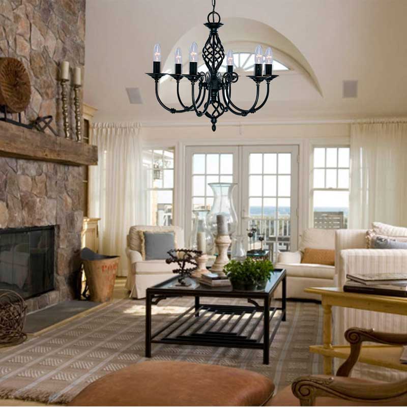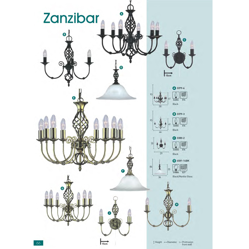 Осветително тяло - полилей в класически стил от ковано желязо с красиво осукани централни елементи, боядисан в черно. Подходящ за кухня, всекидневна, трапезария или спалня. Серия Zanzibar на Searchlight, Англия.