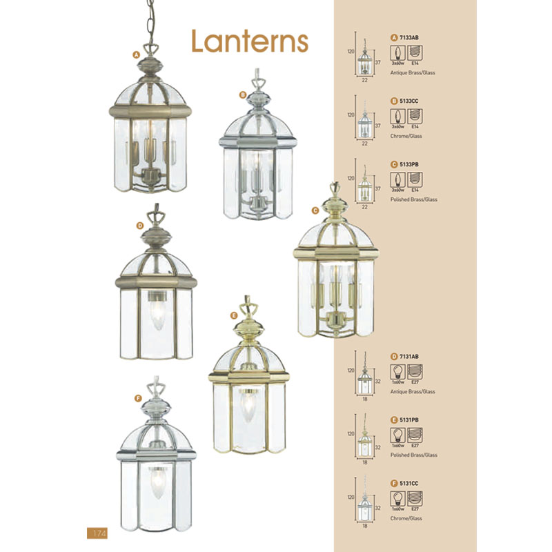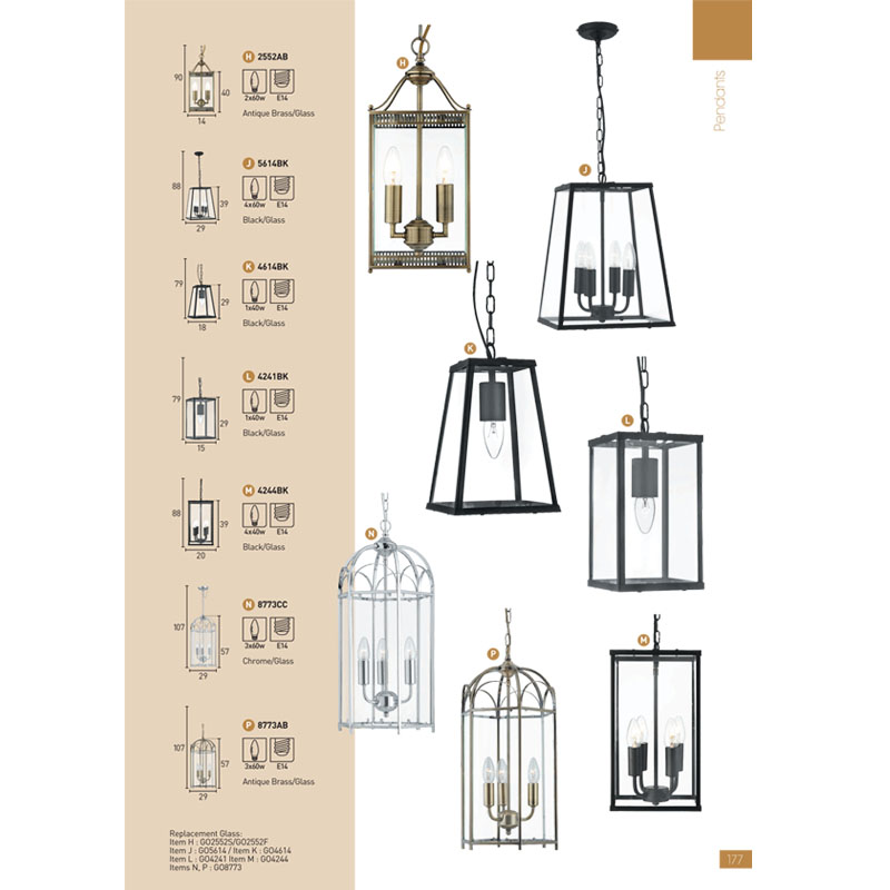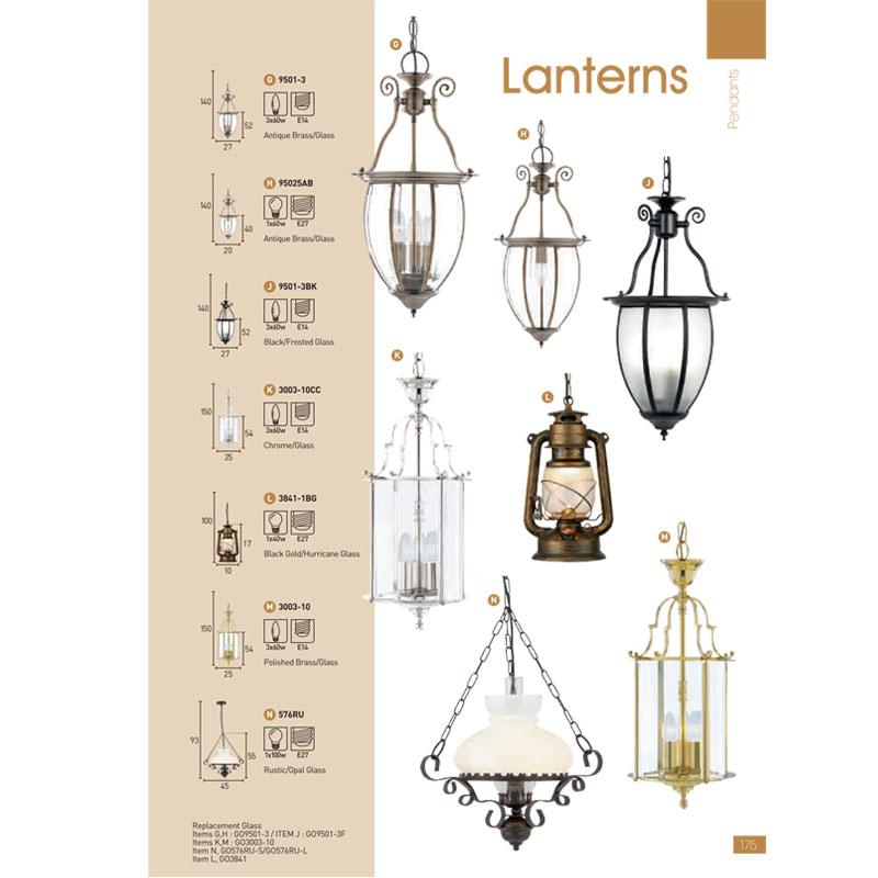 Осветително тяло - оригинален полилей за интериорно осветление, наподобяващ градински фенер и с атрактивен винтидж дизайн, изработен от метална рамка, боядисана в черно и прозрачно стъкло. Част от серия осветителни тела Lanterns на Searchlight, Англия.