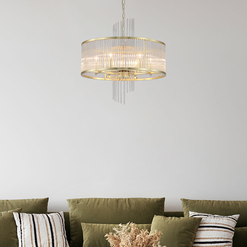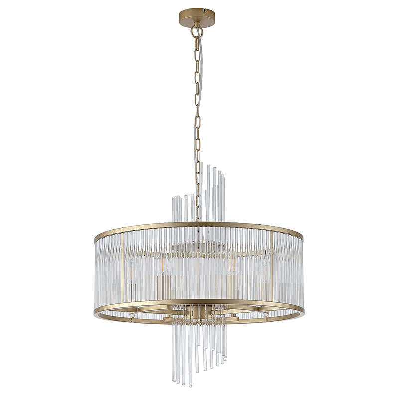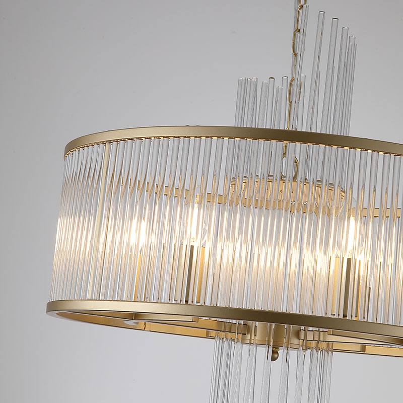 Комбинацията от златист метал и прозрачни стъклени пръчки придава на полилея изтънчено излъчване и го превръща в силен декоративен акцент.