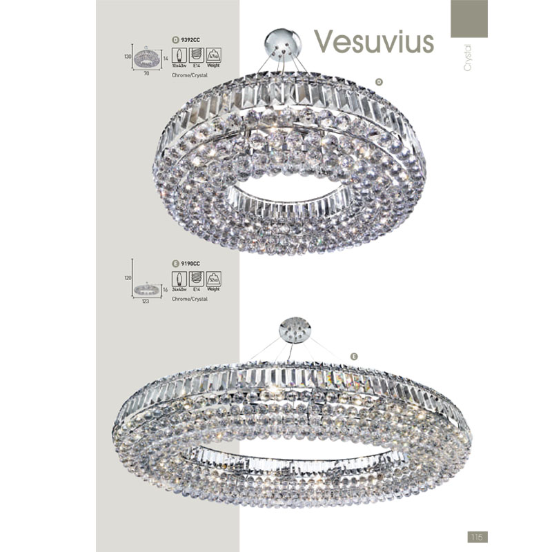 Осветително тяло - полилей от серия осветителни тела Vesuvius, израбоетн от овална метална рамка с хромирано покритие и ефектна декорация от квадратни, правоъгълни и сферични кристали. Подходящ за всекидневна или спалня, както и за общствено помещение. Производител Searchlight, Англия.