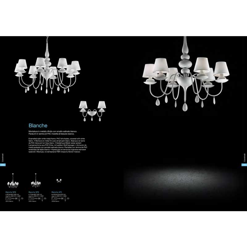 Оригинален и стилен полилей с боядисана в сатенирано бяло метална рамка, декоративни елементи във форма на капки и абажури от PVC, покрити с бял плат. Серия осветителни тела Blanche на Идеал Лукс, Италия.