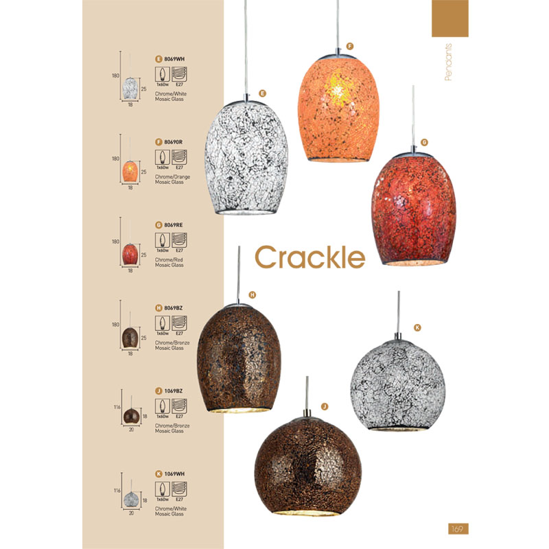 Осветително тяло - интериорен полилей с атрактивен и модерен дизайт, изработен от метал с хромирано покритие и стъклени дифузери, декорирани с парченца бяло стъкло като мозайка. Серия осветителни тела Crackle на Searchlight, Англия.