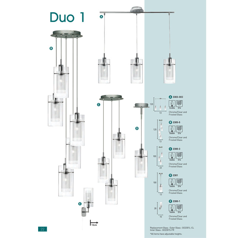 Осветително тяло - стилен полилей в модерен стил от колекцията осветителни тела DUO I, изработен от хромирана метална рамка и двойни дифузери - релефен вътрешен от прозрачно стъкло с матирана средна част и външен от прозрачно стъкло. Производител Searchlight, Англия.