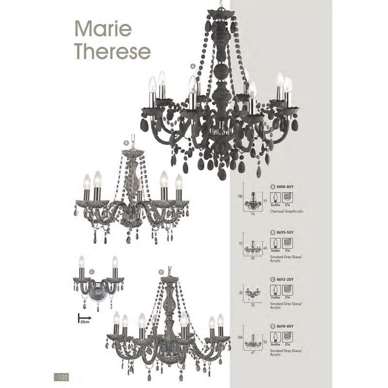 Осветително тяло - полилей за интериорно осветление от серия осветителни тела Marie Therese, със стилен и елегантен дизайн, изработен от метална основа и елементи с хромирано покритие и рамена, централни елементи, чинийки и изящни декоративни елементи от графитено сив акрил. Производител Searchlight, Англия.