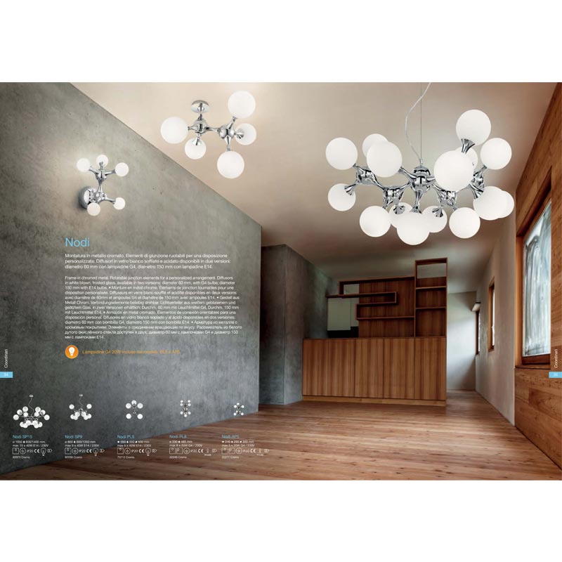 Оригинален полилей Nodi с модерен дизайн, хромирана метална рамка с подвижни рамена, позволяващи аранжиране според индивидуалните предпочитания и сферични дифузери от бяло матирано стъкло. Производител Идеал Лукс, Италия.