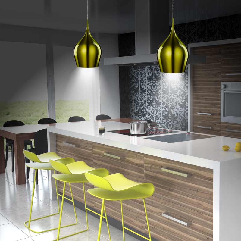 Осветително тяло - полилей, изработен от алуминий в зелен цвят. Артикулът е от серия осветителни тела VIBRANT на производител SEARCHLIGHT, Англия. Дизайнът интересен и модерен, подходящ за всекидневна, кухня и спалня.