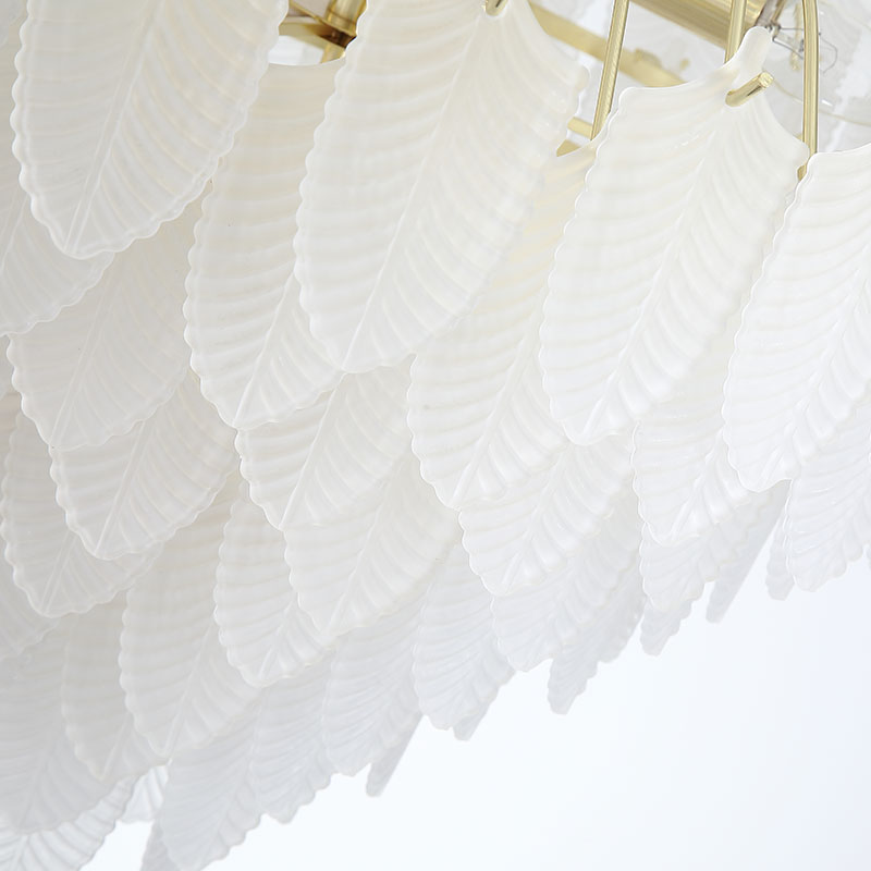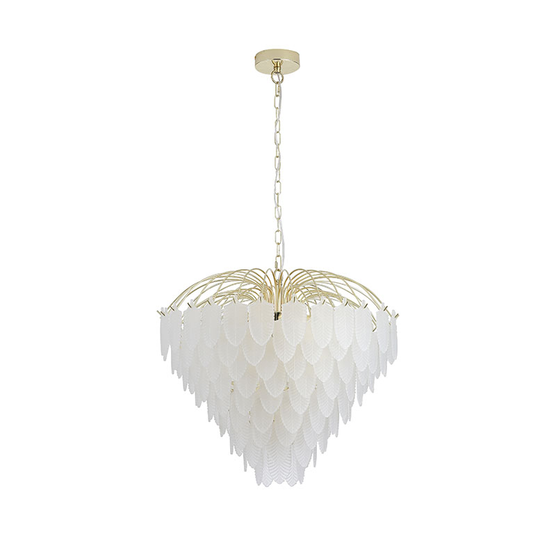 Полилеят е изработен от висококачествен метал с финиш в полиран месинг, съчетан с релефни, матирани стъклени елементи във форма на пера. Стъклото с матирано покритие омекотява светлината, придавайки ѝ ефирност и равномерно разпределение. Конструкцията от полиран месинг добавя топъл златист отблясък и подчертава елегантния силует на лампата.