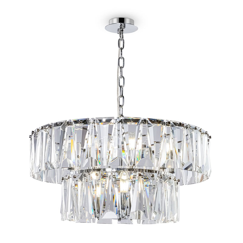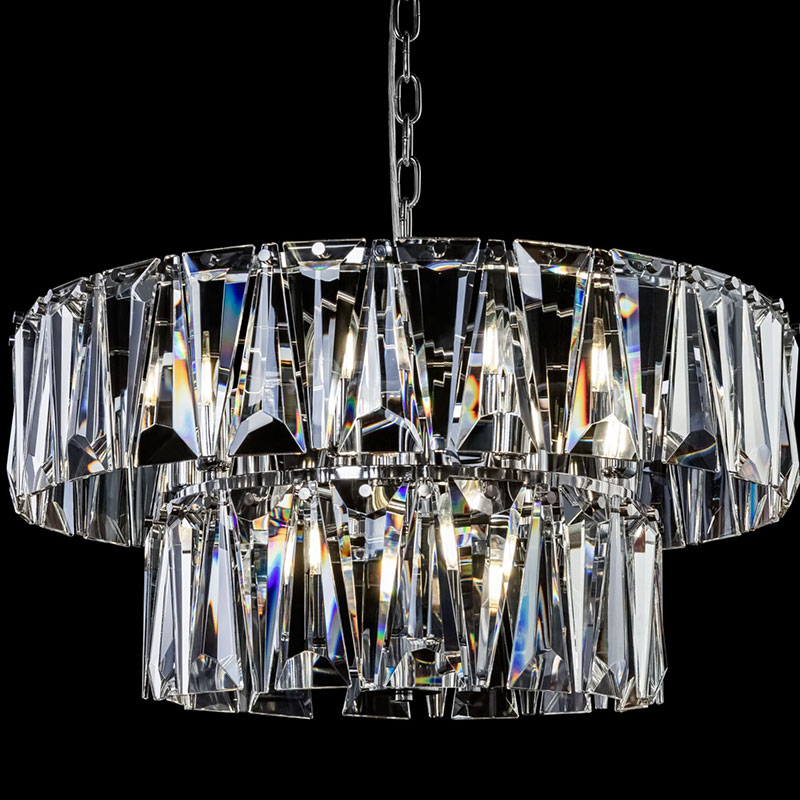 Полилей Puntes е изработен от метал в цвят хром с богато декориран разсейвател от прозрачни кристали. Дизайнът е изграден на три нива с вертикално подредени кристални елементи, които улавят и пречупват светлината във всички посоки.