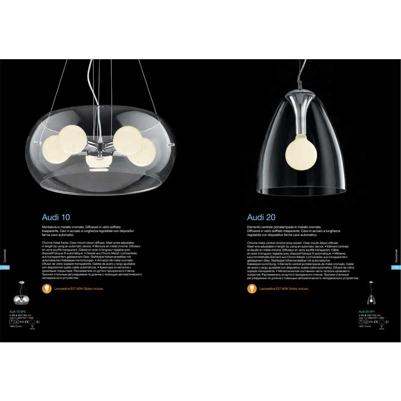 Модерен полилей с хромирана метална централна част и ръчно изработен дифузер от прозрачно стъкло. Серия осветителни тела Audi 20 на Ideal Lux, Италия.