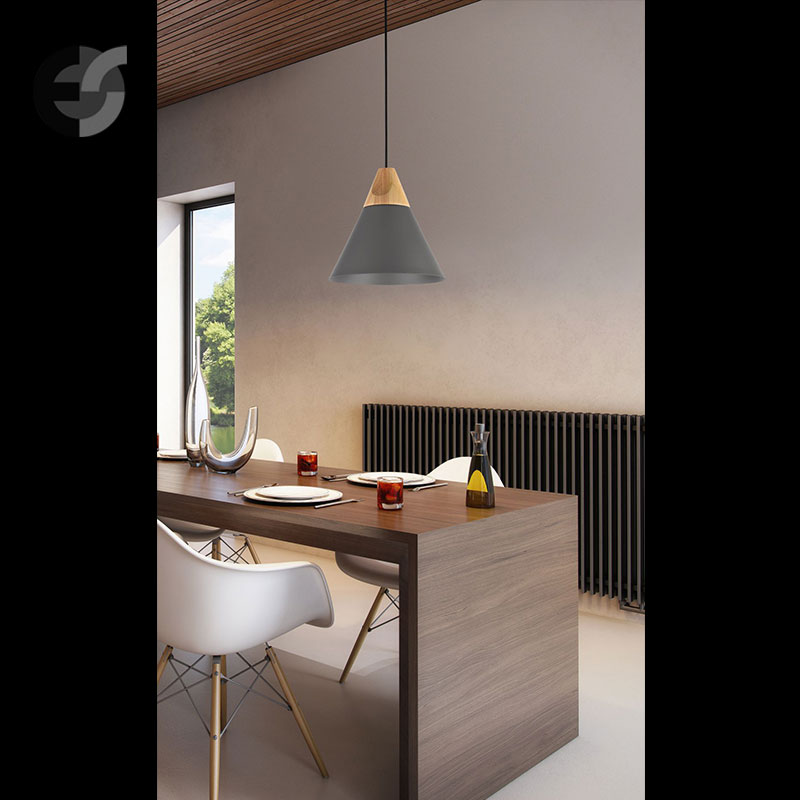 Полилей Bicones е изработен от метал в бял цвят, допълнен с дървен акцент. Конусовидната форма на разсейвателя осигурява насочено осветление, което е идеално за създаване на уютна и приветлива атмосфера.