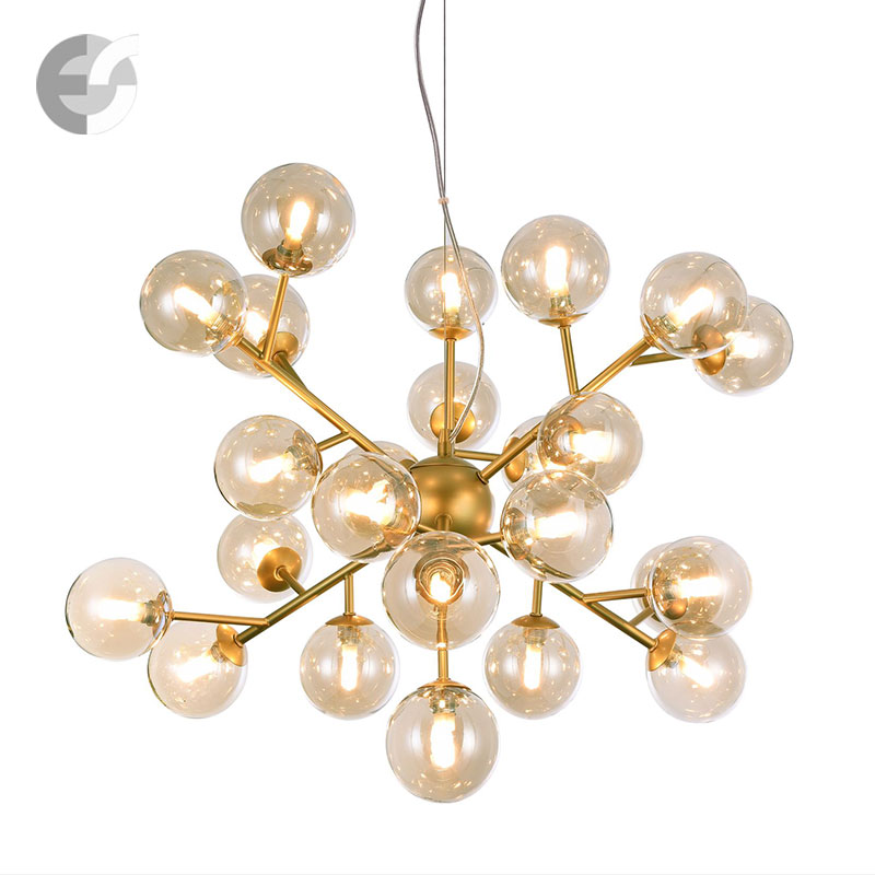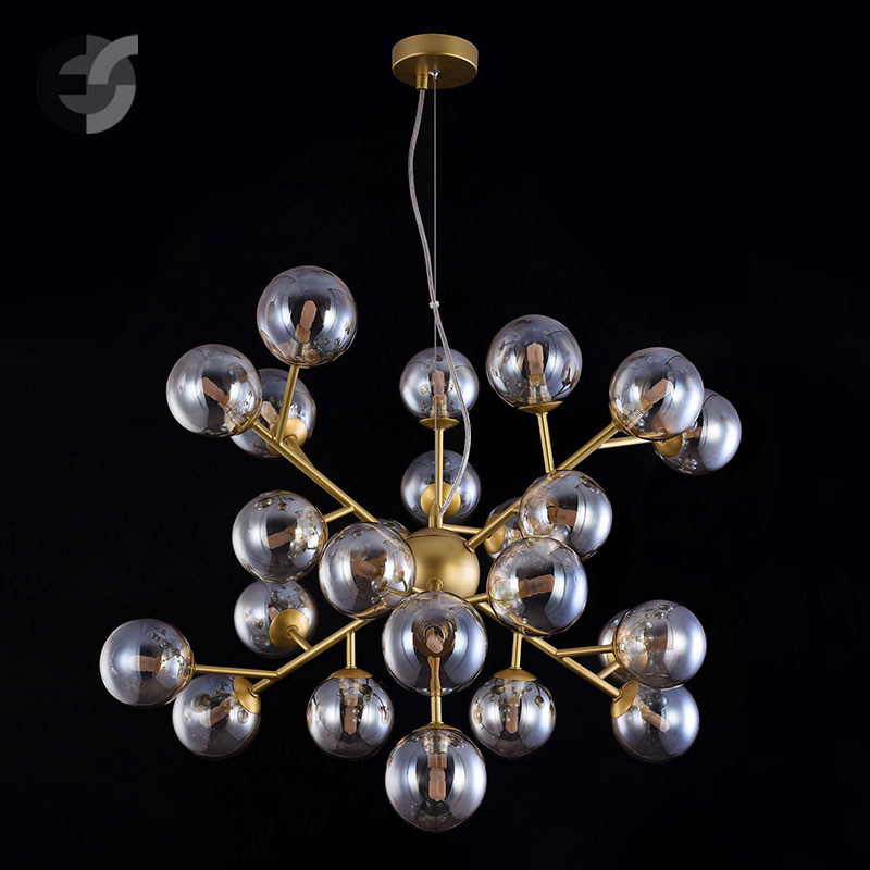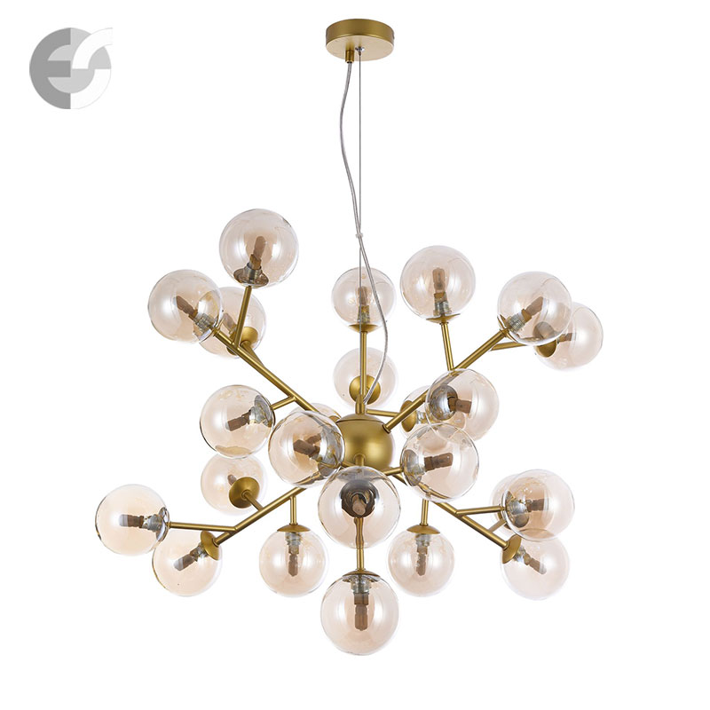Полилей Dallas е не просто осветително тяло, а истинско произведение на изкуството. Изработен от метал в стилен златист цвят и разсейватели от прозрано издухано стъкло. Висящата лампа е с уникален дизайн, със симулация на молекуларна структура, която го прави изключително интересен и модерен. Осветителното тяло Dallas е идеално за осветление във всекидневна, спалня или трапезария, където може да създаде уникална атмосфера и да бъде акцент в интериора.