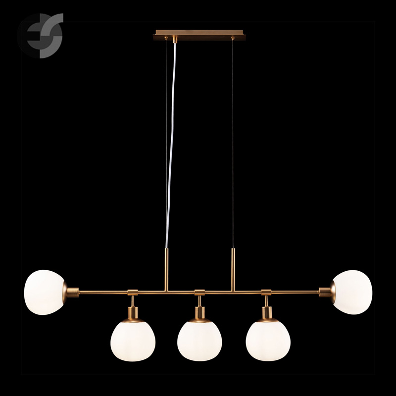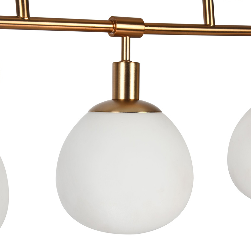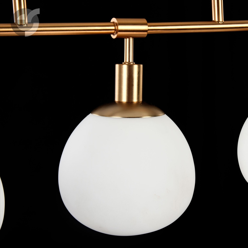 Стъклените абажури разпръскват светлината меко и равномерно, създавайки комфортно осветление, което е подходящо за трапезария, хол или осветяване на барплот. Дизайнът на полилея съчетава естетика и практичност, като предлага модерно осветително решение, което допълва различни интериорни стилове.