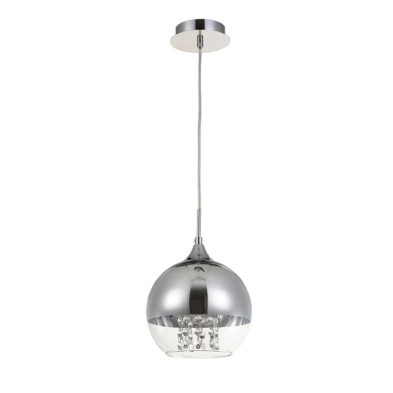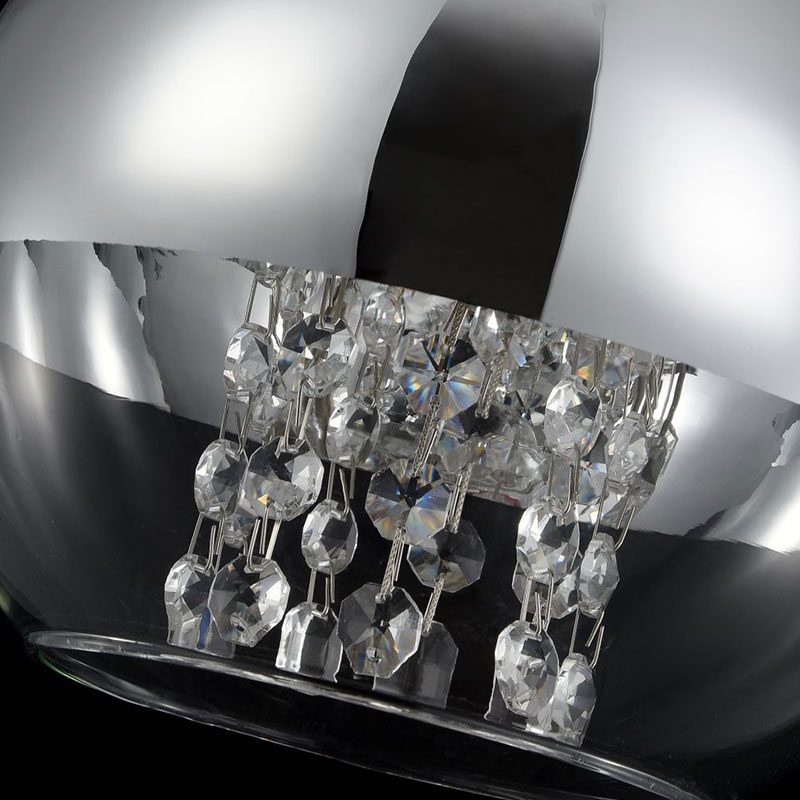 Полилей Fermi е изработен от метал в цвят никел и сферичен разсейвател, при който горната част е от хромирано стъкло, а долната от прозрачно. Висящата лампа привлича вниманието с декоративни кристали, които се спускат в средата на сферата, пречупвайки светлината и създавайки омайващи светлинни отражения в помещението.