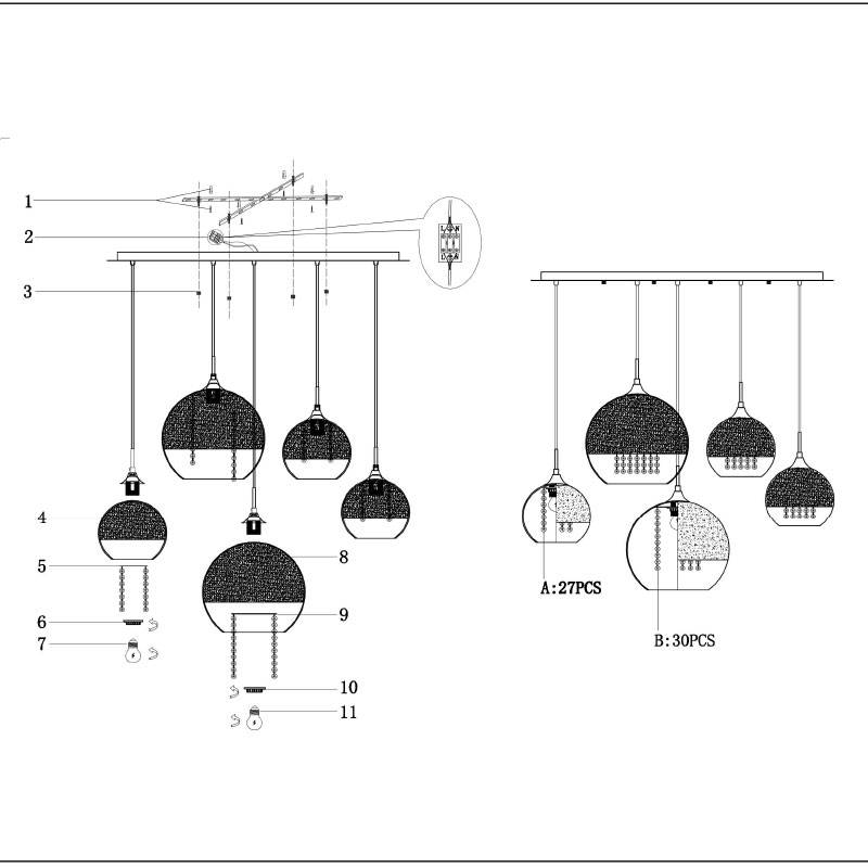 Полилей Fermi е изработен от метал в златист цвят и сферични разсейватели, при които горната част е от хромирано стъкло, а долната от прозрачно. Висящата лампа привлича вниманието с декоративни кристали, които се спускат в средата на сферите, пречупвайки светлината и създавайки омайващи светлинни отражения в помещението.