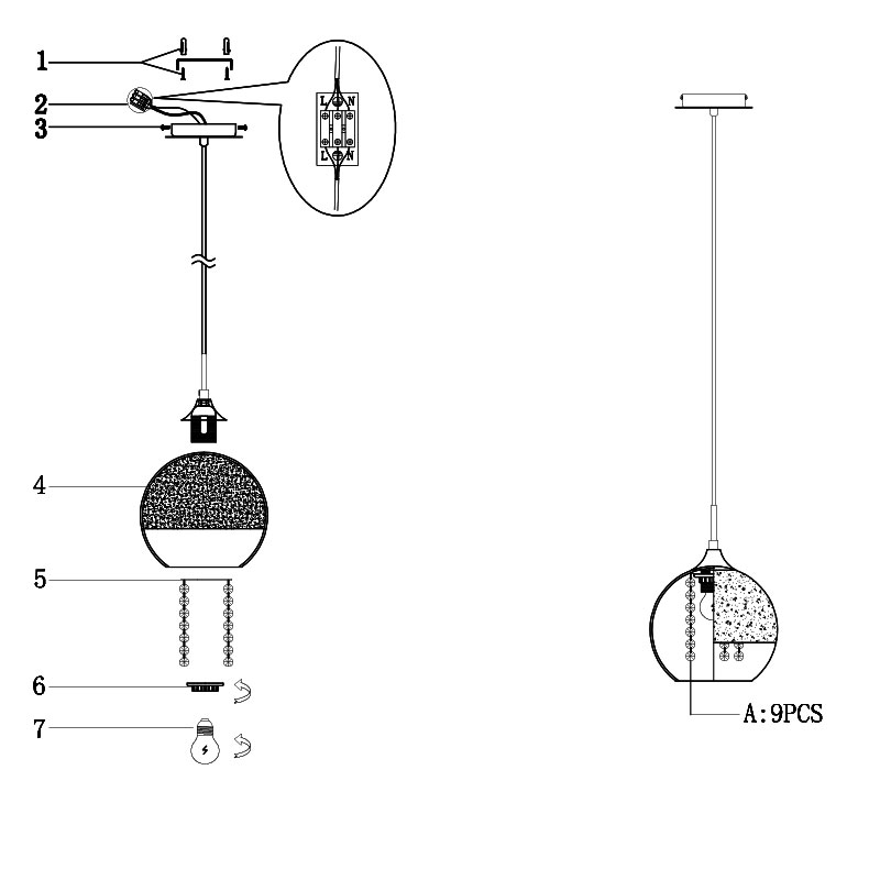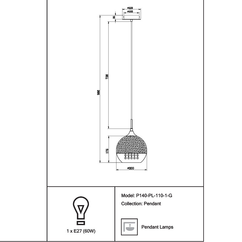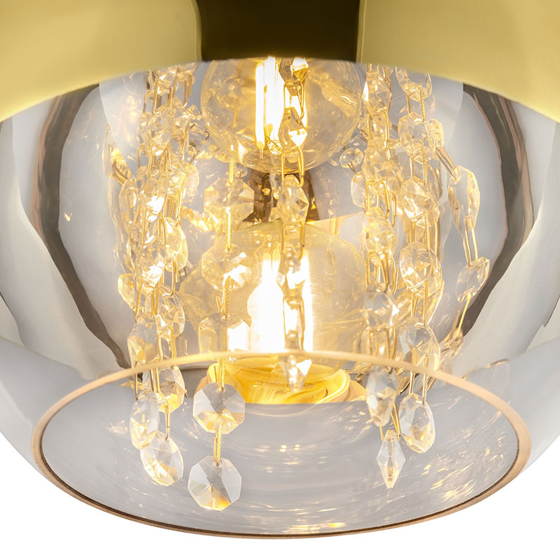 Полилей Fermi е изработен от метал в златист цвят и сферичен разсейвател, при който горната част е от хромирано стъкло, а долната от прозрачно. Висящата лампа привлича вниманието с декоративни кристали, които се спускат в средата на сферата, пречупвайки светлината и създавайки омайващи светлинни отражения в помещението.