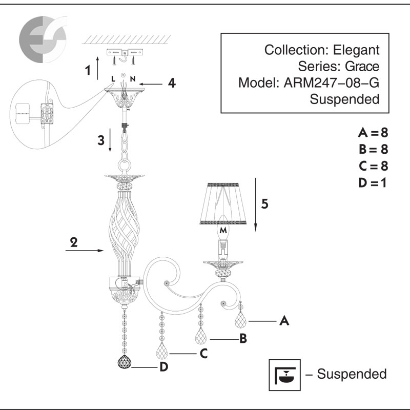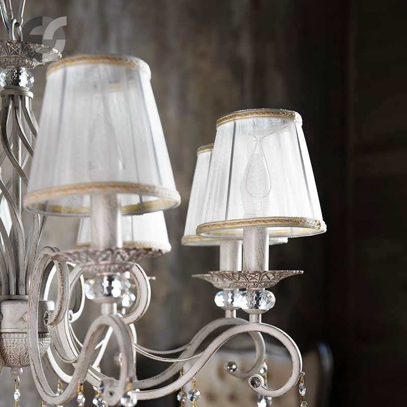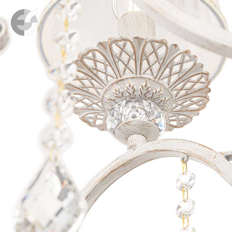 Полилей Grace е изработен от бял метал с акцент наподобяващ дърво и разсейватели от органза в златист цвят. Декориран е с изящни висящи кристали от стъкло във формата на капки, които добавят блясък и изтънченост към осветлението.