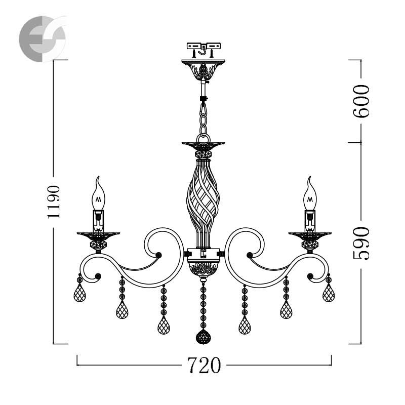 Класическият полилей е тип свещ с конусовидни разсейватели. Осветителното тяло е с верижно окачване, което позволява регулиране на височината, преди монтаж.