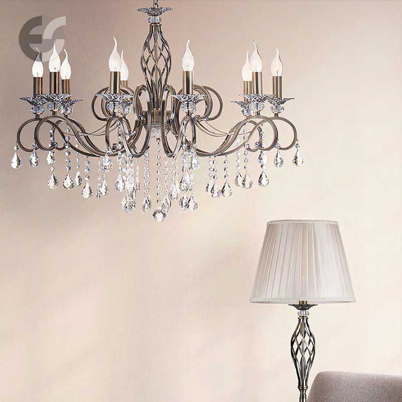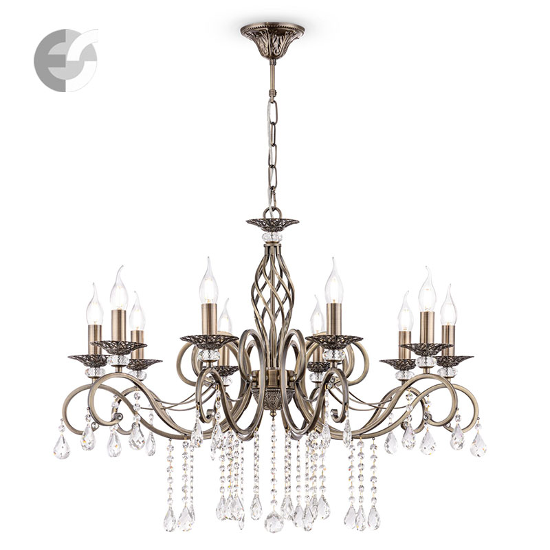 Полилей тип свещ Grace е изработен от метал в цвят античен месинг. Конструкцията на осветителното тяло е с извити орнаменти и симетрично подредени висящи кристали в капковидна форма, които подчертават класическия му стил. Светлоизточниците наподобяват свещи, създавайки мека и топла атмосфера.