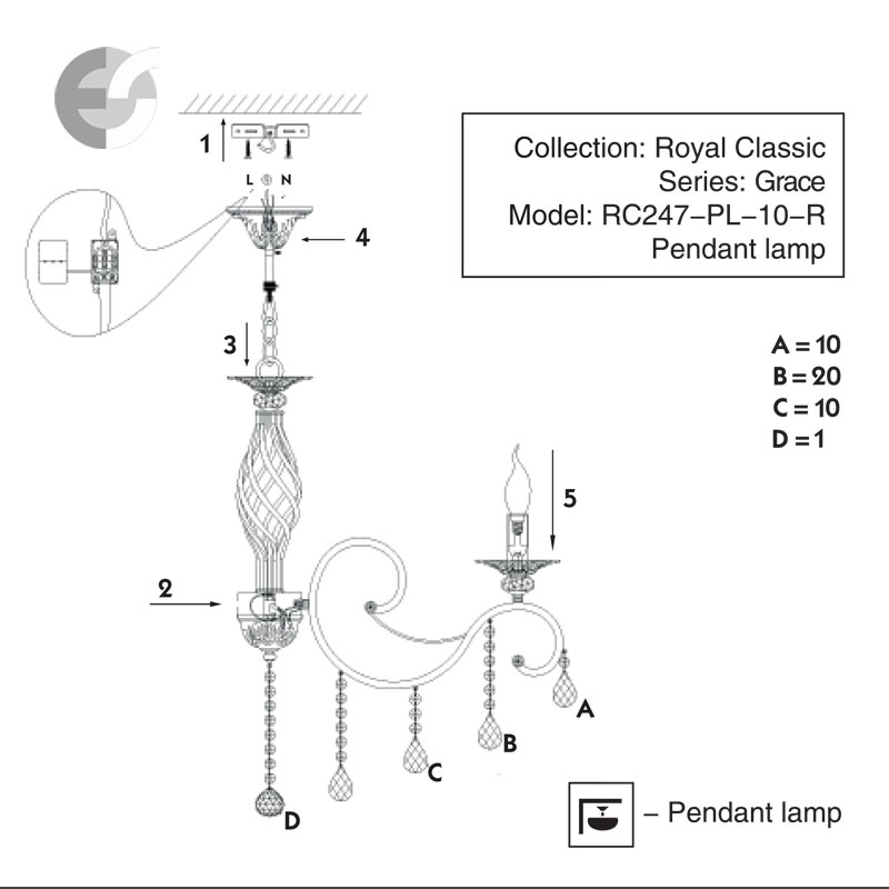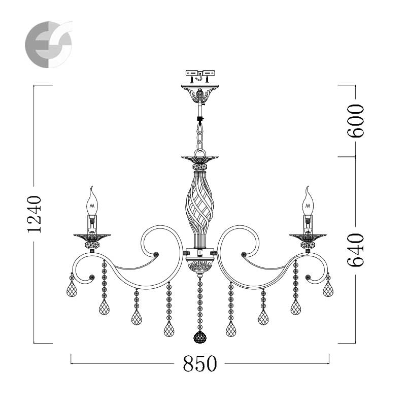 Висящата лампа е с верижно окачване, което позволява регулиране на височината преди монтаж. Полилеят е подходящ за осветление за хотел, спалня или всекидневна.