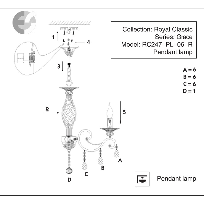 Висящата лампа е с верижно окачване, което позволява регулиране на височината преди монтаж. Полилеят е подходящ за осветление за хотел, спалня или всекидневна.