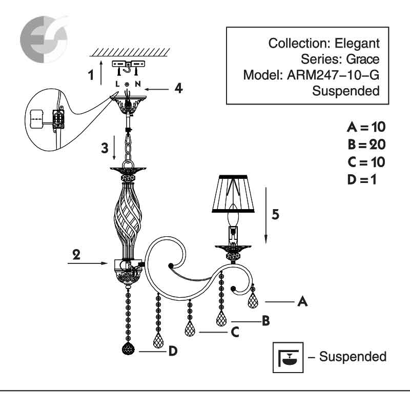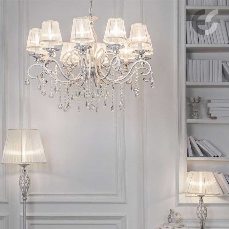 Полилей Grace е изработен от бял метал с акцент наподобяващ дърво и разсейватели от органза в златист цвят. Декориран е с изящни висящи кристали от стъкло във формата на капки, които добавят блясък и изтънченост към осветлението.