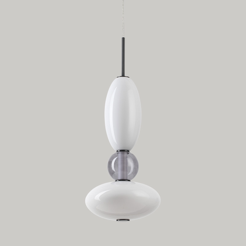 LED полилей LUMIERE-1, изработен от метална основа с артистичен дизайн, стъклени разсейватели в матиран бял цвят с акценти от прозрачно стъкло. Полилеят е с прозрачен PVC кабел, а капачката на розетката е с магнитно захващане за бърз и лесен монтаж.