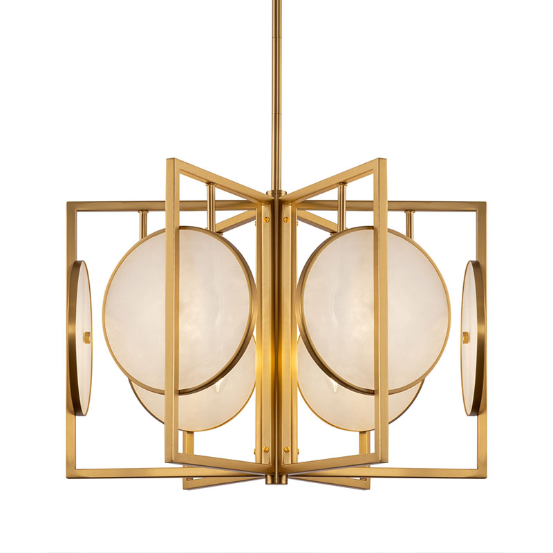 Полилей Marmo, изработен от метал в златист цвят, впечатлява с модерна геометрична конструкция и елементи от естествен камък с мраморен ефект. Кръглите акценти около централния светлоизточник създават мека и равномерна светлина, която внася усещане за спокойствие и стил.