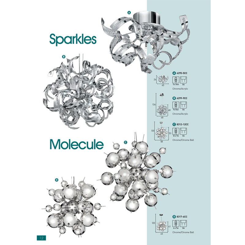 Осветително тяло - полилей в модерен стил, изработен от хромирани сфери. Подходящ за интериорно осветление в заведение, трапезария, спалня или всекидневна. Серия осветителни тела MOLECULE на SearchLight, Англия.