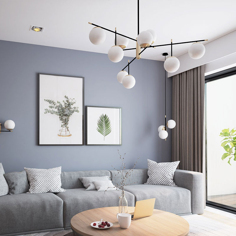 Белите стъклени сфери разпръскват меко и равномерно осветление, което създава уютна и приятна атмосфера. Контрастът между златистия метал и черните елементи добавя стил и характер, правейки осветителното тяло акцент в интериора.