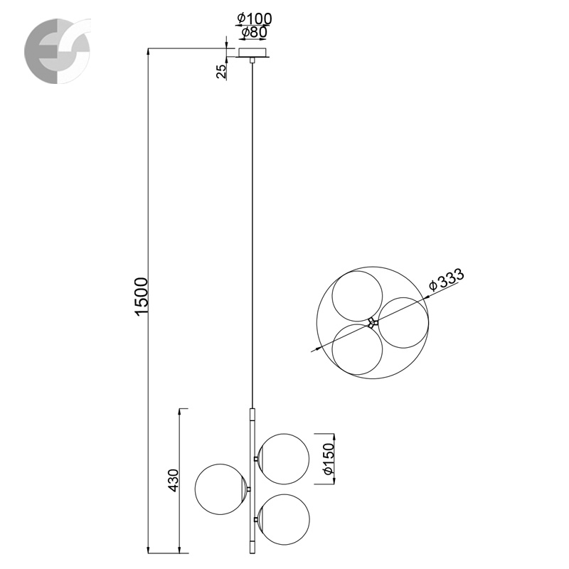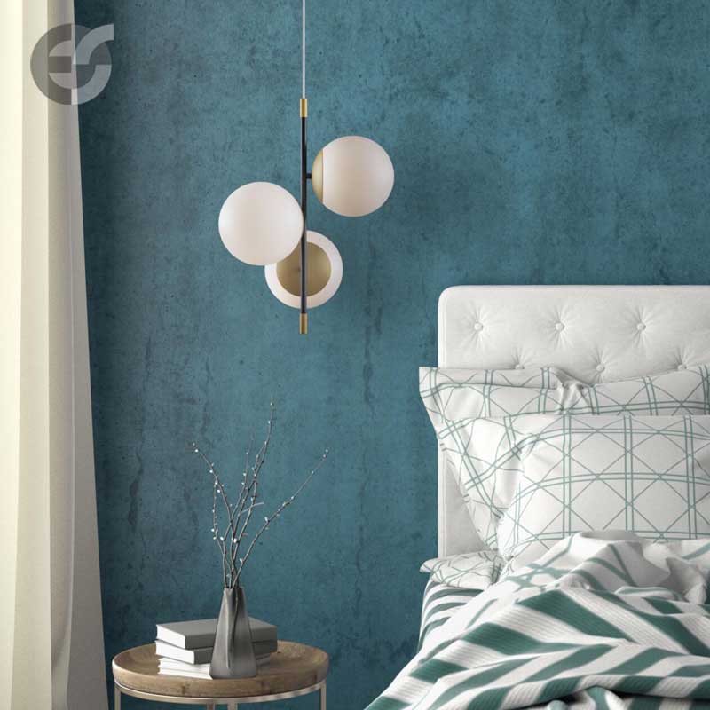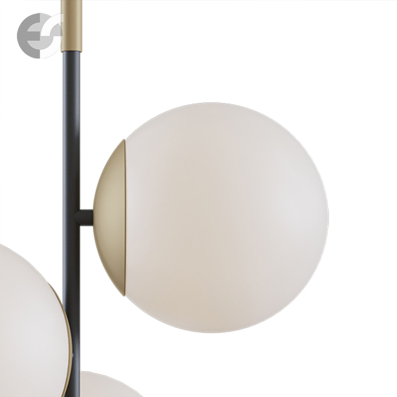 Белите стъклени сфери осигуряват равномерно разпределение на светлината, допринасяйки за уютна и комфортна атмосфера. Висящата конструкция придава лекота на дизайна, като позволява гъвкаво позициониране спрямо интериора.