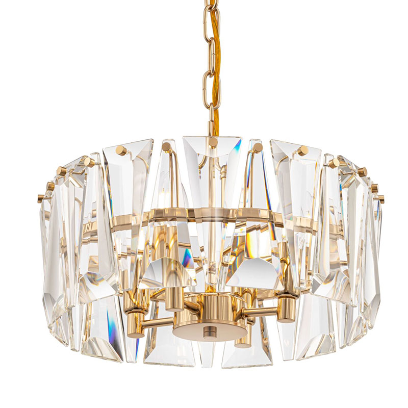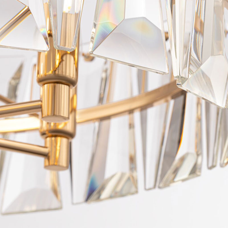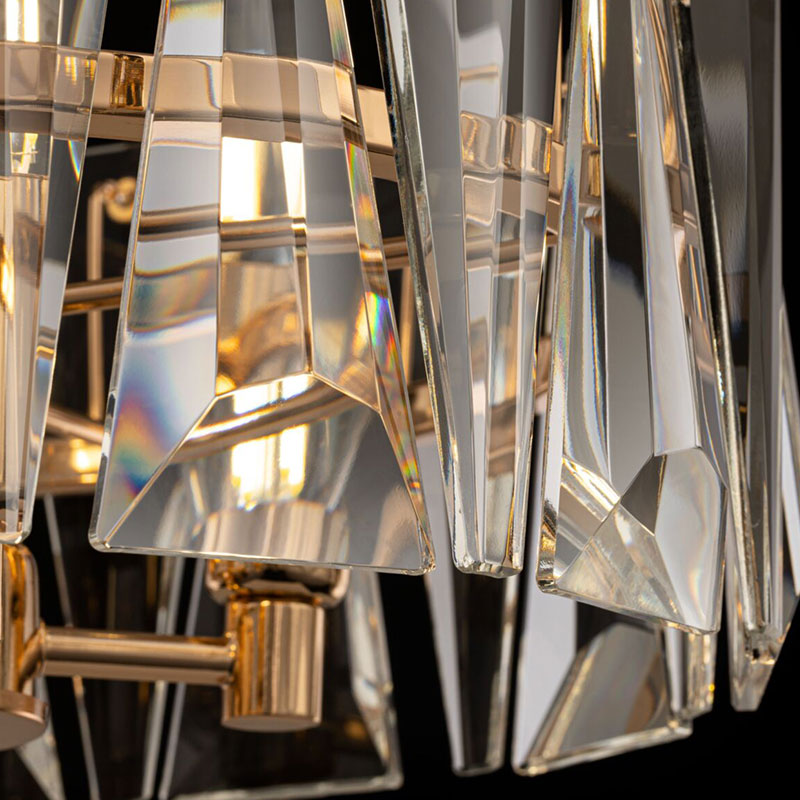 Кристалните елементи са масивни и прецизно изрязани, така че пречупват светлината с наситен блясък, създавайки усещане за дълбочина и изтънченост. Златистият цвят добавя мек, топъл отенък и елегантен контраст към прозрачните кристали, придавайки характер на цялото осветително тяло.