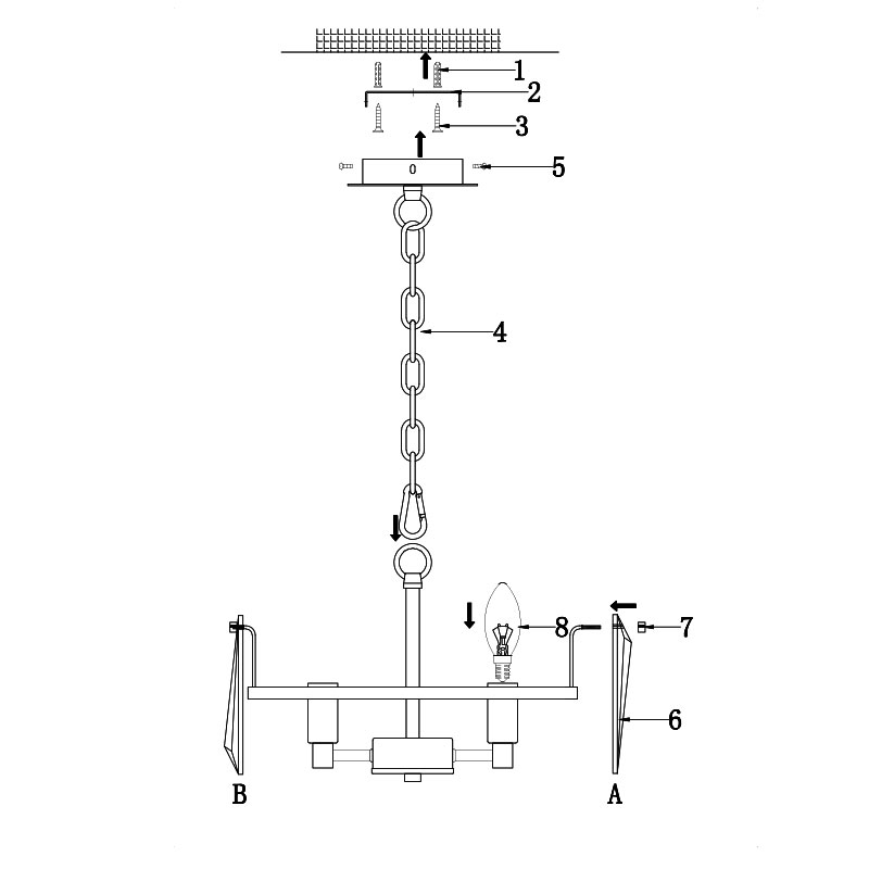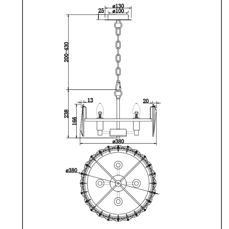 Окачването на полилея е с метална верига, което позволява регулиране на височината спрямо помещението, преди монтаж.