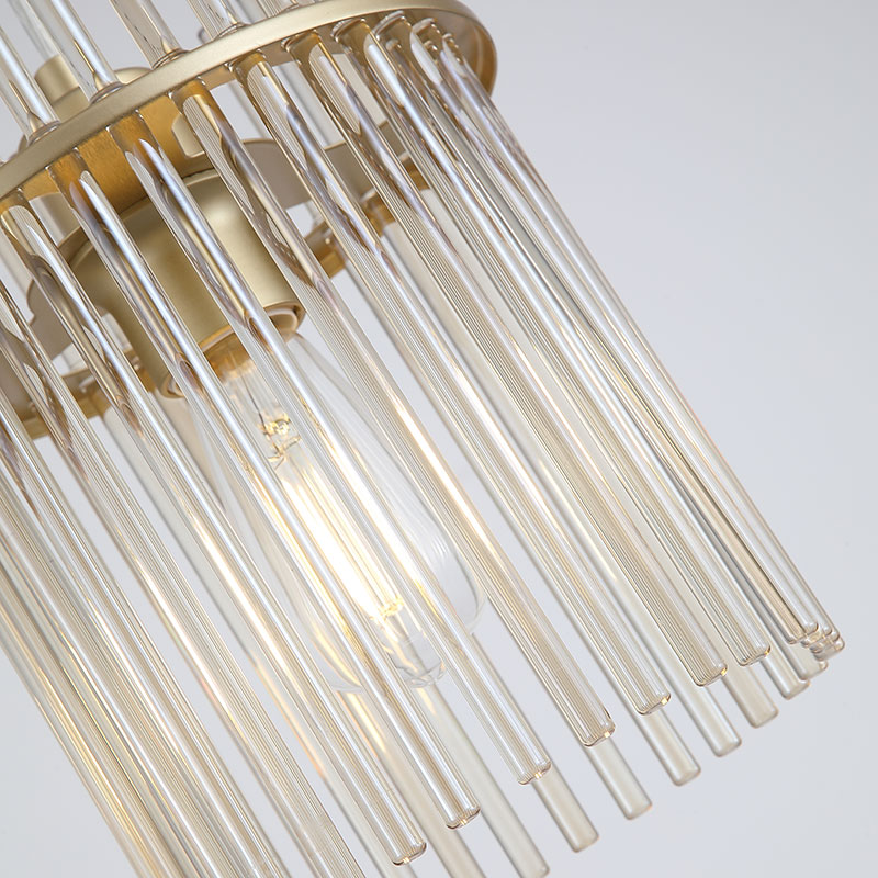 Абажурът е изработен от вертикално подредени стъклени елементи, които придават лекота и фин блясък на осветителното тяло. Шампанското стъкло омекотява светлината и създава топла, уютна атмосфера, като същевременно добавя нотка лукс и визуална дълбочина.