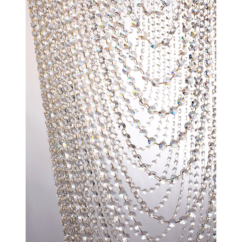 Луксозният полилей Swoop е изработен от метал в елегантен сатениран месинг, с висящи верижки, украсени със стъклени кристалчета, които придават блясък и изтънченост на всяко пространство. С впечатляващите 10 светлинни източника, този полилей създава ефектно осветление, което допълва атмосферата на всяка стая, като добавя нотка на лукс.