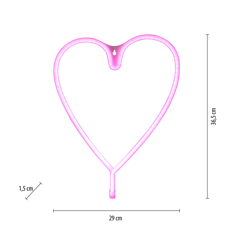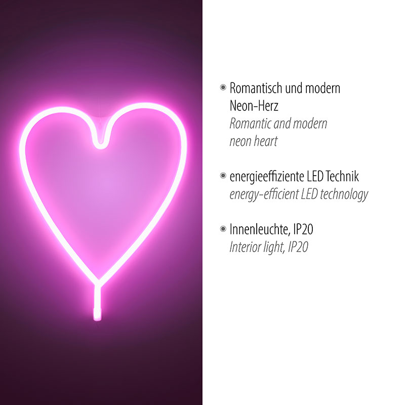 Светещо сърце за стена Herz. Идеалната декоративна лампа за вашата стая. Неоновата лампа се захранва чрез USB кабел. Кабелът е включен. Всичко, от което се нуждаете, е стандартно захранване. Енергоспестяващата LED лампа кара сърцето да свети в силно розово. Производител Leuchten Direkt, Германия.