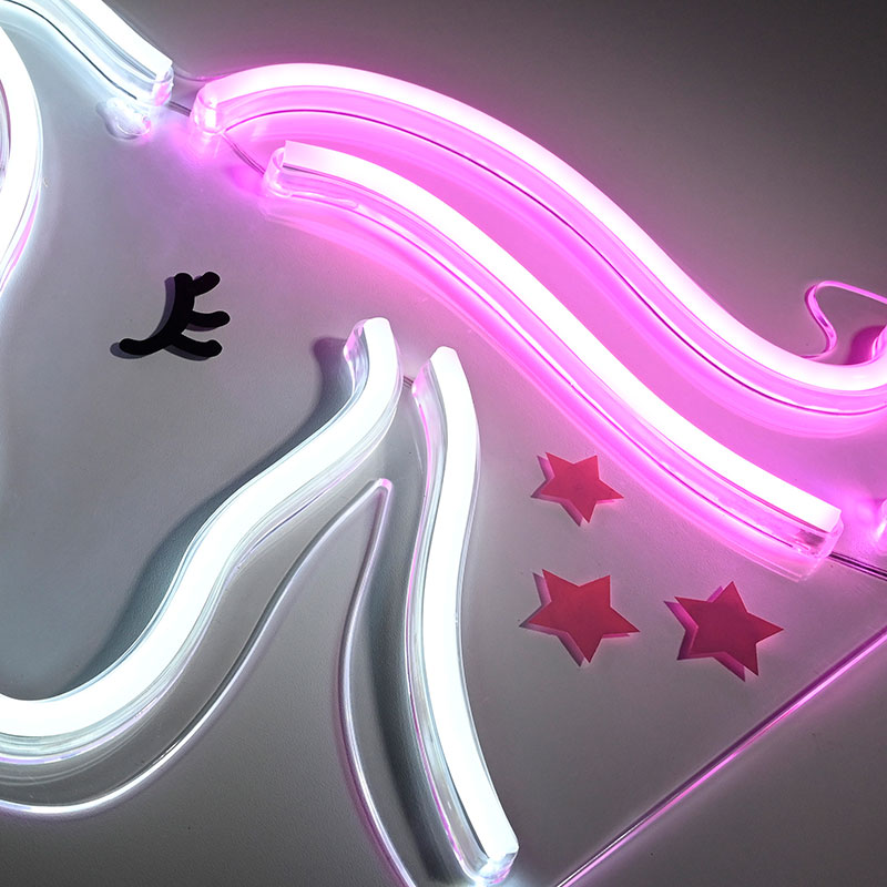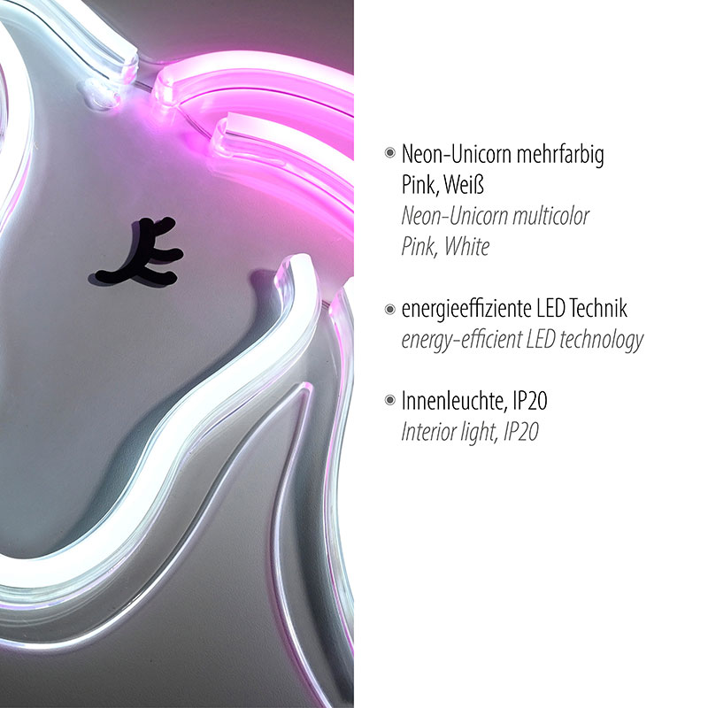 Светещ еднорог за стена Unicorn. Създайте атрактивна атосфера към вашата стая. Неоновата лампа се захранва чрез USB кабел. Кабелът е включен. Всичко, от което се нуждаете, е стандартно захранване. Енергоспестяващият LED източник на светлина кара надписа да блести в ярки цветове. Неоновата светлина е много здрава и лесна за инсталиране благодарение на акрила. Производител Leuchten Direkt, Германия.