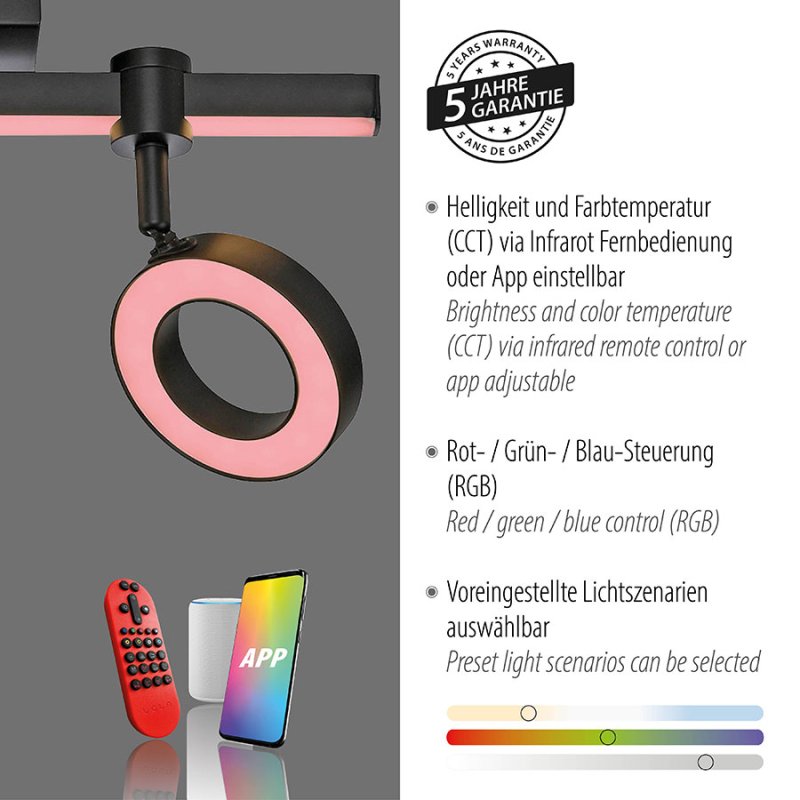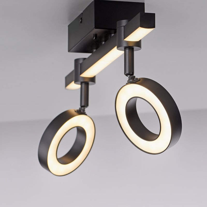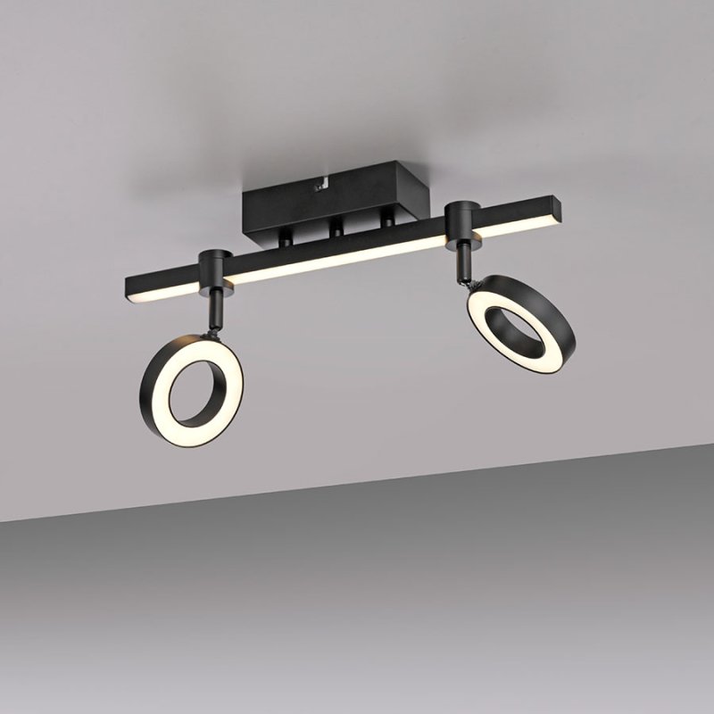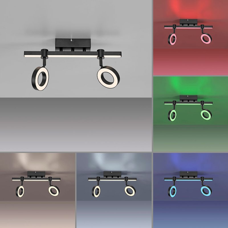 LED плафон LOLASmart-BILEDA, с два светлоизточника, съчетава интелигентна технология и изчистен дизайн. Черната метална основа и пластмасовият разсейвател осигуряват модерна визия и равномерно разпределение на светлината. Въртящите се светлоизточници позволяват насочване на осветлението към желаните зони, добавяйки акцент и стил в интериора.