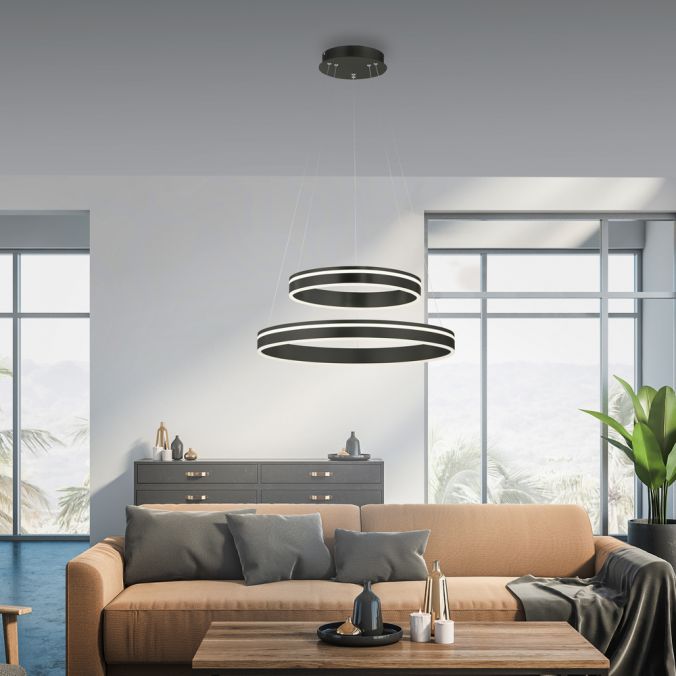 LED полилей Q-VITO в цвят антрацит се отличава с модерен, кръгъл дизайн и интелигентни функции за персонализирано осветление. Благодарение на възможността за регулиране на цветната температура от топло бяло (2700 K) до дневна бяла светлина (5000 K), създава желаната атмосфера в помещението. Регулирането се осъществява с Q® дистанционно управление, което позволява контрол върху яркостта, цвета и запаметяване на предпочитаните настройки.