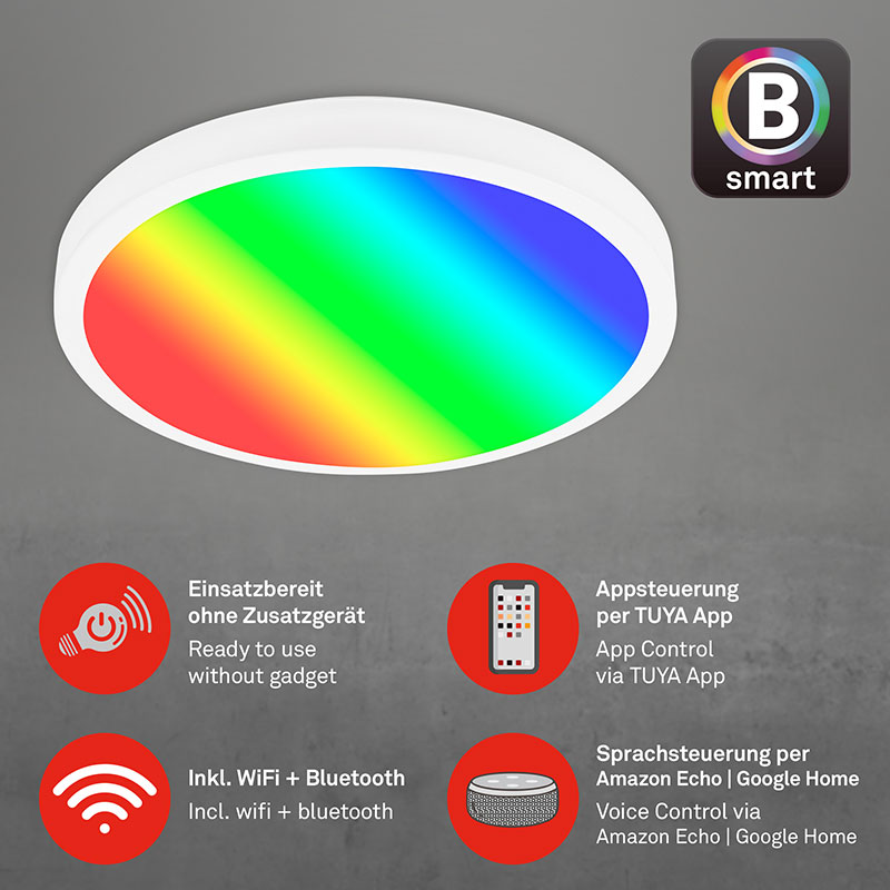 Смарт функциите на този плафон го правят особено удобен за всякакви ситуации. Той разполага с Wi-Fi и Bluetooth възможности и е съвместим с iOS и Android системи, както и с умни говорители като Amazon Echo и Google Home. Това ви дава възможност да го управлявате през вашите смарт устройства или чрез гласови команди.