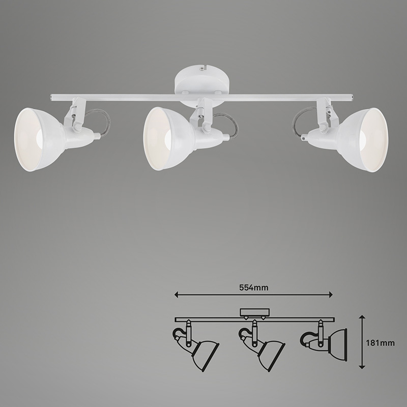 Осветително тяло - лампа във винтидж стил за стена или таван, изработена от метал в бял цвят. Главите на спота са подвижни за прецизно насочване на светлината. Дизайнът на осветителното тяло е подходящ за осветление за всекидневна, осветление за коридор, осветление за заведение. Производител BRILO, Германия.