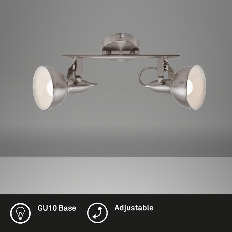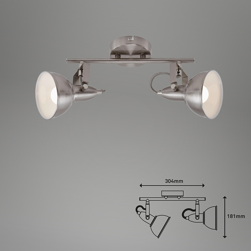 Осветително тяло - лампа във винтидж стил за стена или таван, изработена от метал в цвят сатениран никел. Главите на спота са подвижни за прецизно насочване на светлината. Дизайнът на осветителното тяло е подходящ за осветление за всекидневна, осветление за коридор, осветление за заведение. Производител BRILO, Германия.