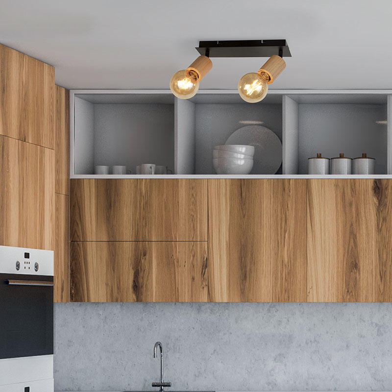 Спот лампа Spinny е изработена от метал в черен цвят, допълнена с дървен акцент, който придава естествена топлина и стил на дизайна. Семплата и форма я прави подходящ избор за различни интериори - от винтидж до модерни. Осветителното тяло е с два светлоизточника, които са с подвижен механизъм и ви позволява да насочвате светлината към желаната зона. Спот лампата е подходяща за всекидневна, кухня, трапезария или коридор.